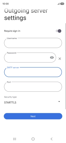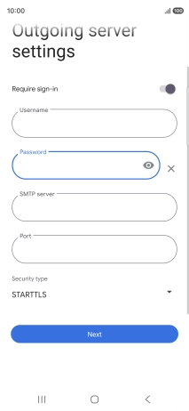 Press the indicator next to "Require sign-in" to turn the function on or off. Please note that if you're using Vodafone's outgoing server, turn off SMTP authentication and leave the username and password fields empty.