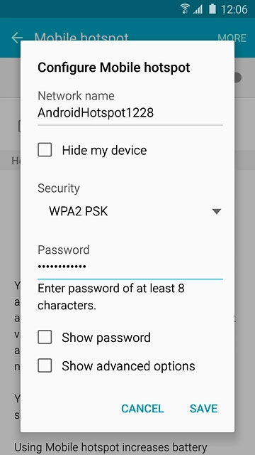 Select settings for Wi-Fi hotspot