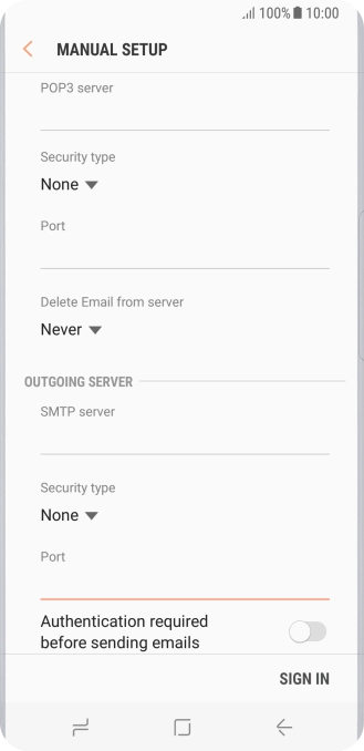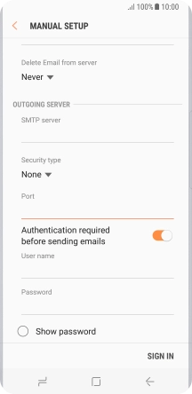 Press the indicator next to "Authentication required before sending emails" to turn the function on or off. Please note that if you're using Vodafone's outgoing server, turn off SMTP authentication and leave the username and password fields empty.