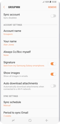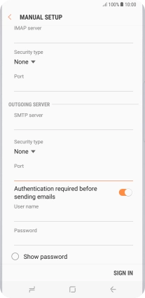 Press the indicator next to "Authentication required before sending emails" to turn the function on or off. Please note that if you're using Vodafone's outgoing server, turn off SMTP authentication and leave the username and password fields empty.