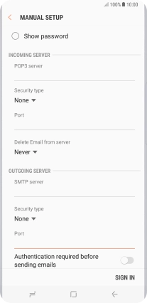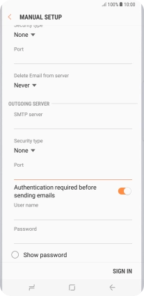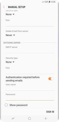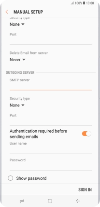 Press the indicator next to "Authentication required before sending emails" to turn the function on or off. Please note that if you're using Vodafone's outgoing server, turn off SMTP authentication and leave the username and password fields empty.