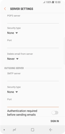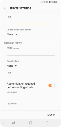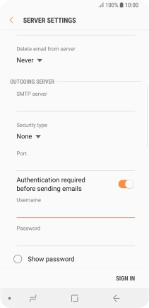 Press the indicator next to "Authentication required before sending emails" to turn the function on or off. Please note that if you're using Vodafone's outgoing server, turn off SMTP authentication and leave the username and password fields empty.