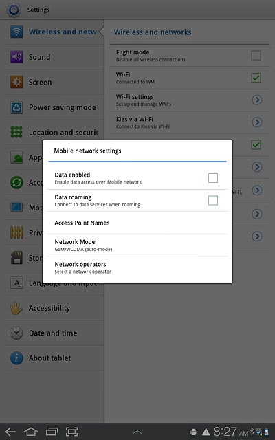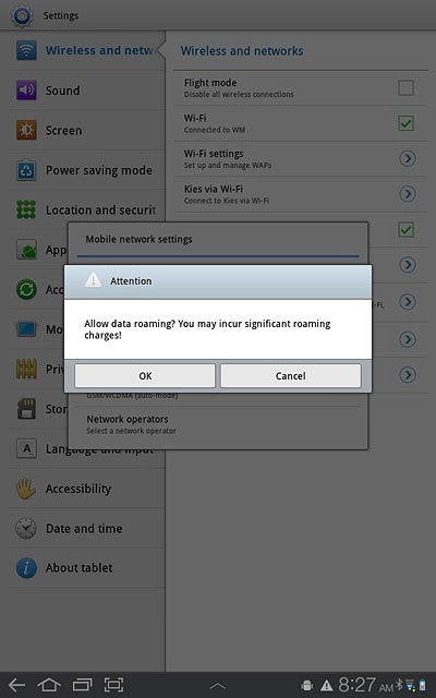 Press Data roaming to turn data roaming on or off.