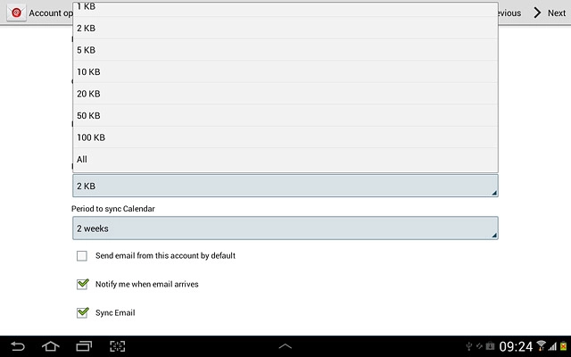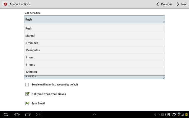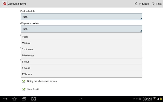 Select settings for synchronising new email messages