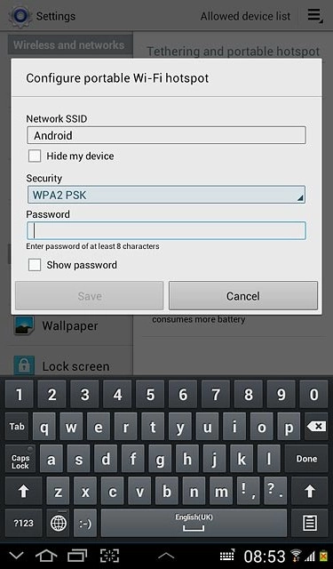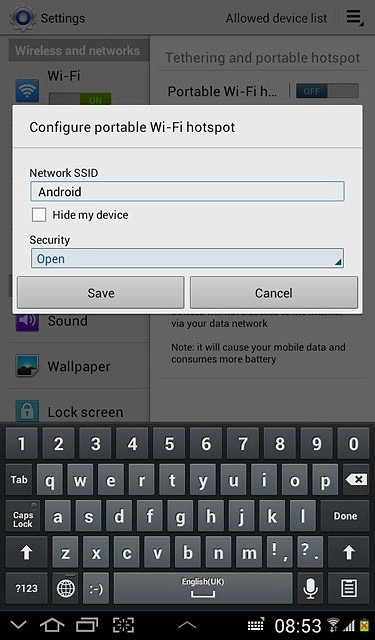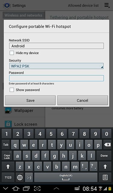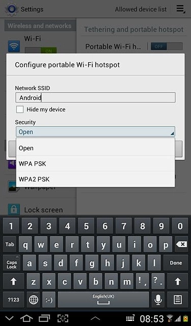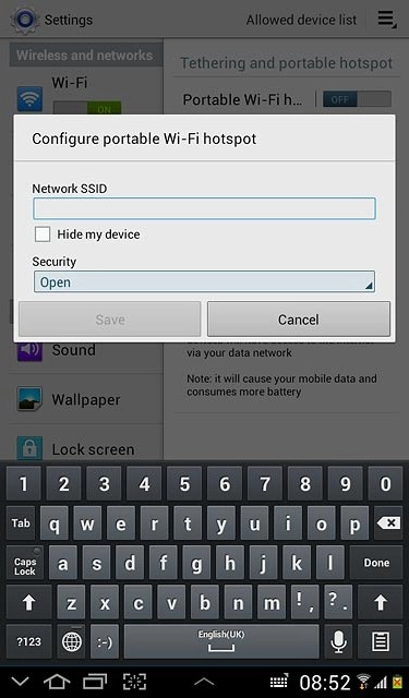 Press the field below Network SSID and key in the required name for the Wi-Fi hotspot.