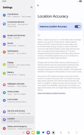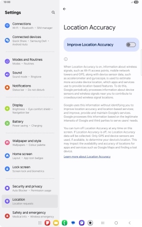 If you press the indicator next to "Improve Location Accuracy" to turn off the function, your tablet can find your exact position using the GPS satellites but it may take longer as there is no access to supplementary information from the mobile network or nearby Wi-Fi networks.