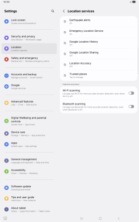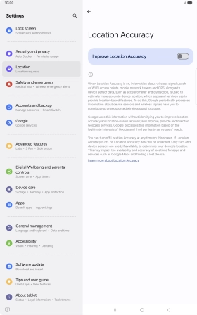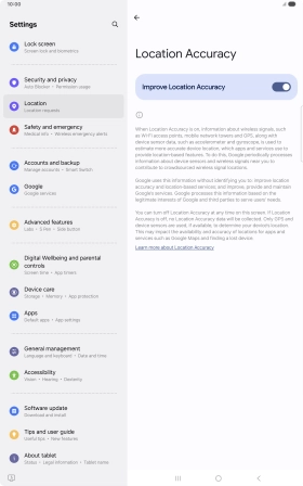If you press the indicator next to "Improve Location Accuracy" to turn off the function, your tablet can find your exact position using the GPS satellites but it may take longer as there is no access to supplementary information from the mobile network or nearby Wi-Fi networks.