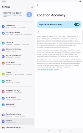 If you press the indicator next to "Improve Location Accuracy" to turn off the function, your tablet can find your exact position using the GPS satellites but it may take longer as there is no access to supplementary information from the mobile network or nearby Wi-Fi networks.
