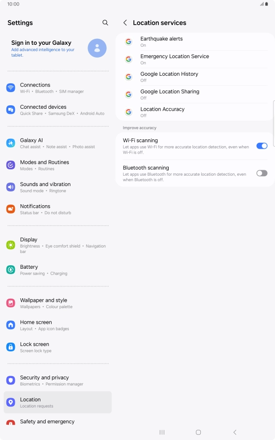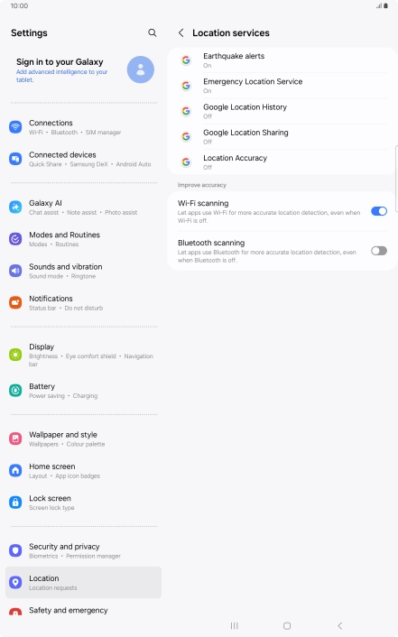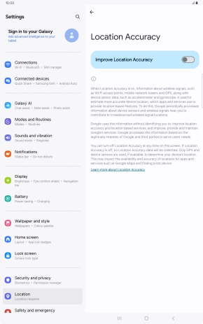 If you press the indicator next to "Improve Location Accuracy" to turn off the function, your tablet can find your exact position using the GPS satellites but it may take longer as there is no access to supplementary information from the mobile network or nearby Wi-Fi networks.