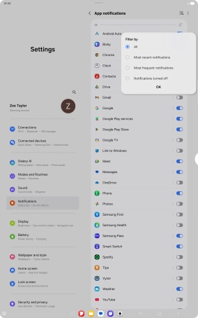 Turn notifications on your Samsung Galaxy Tab S11 Ultra 5G Android 16 on or off