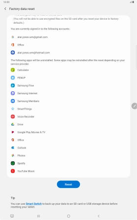 Press Delete all. Wait a moment while the factory default settings are restored. Follow the instructions on the screen to set up your tablet and prepare it for use.