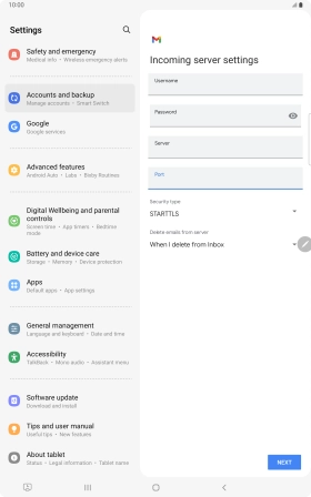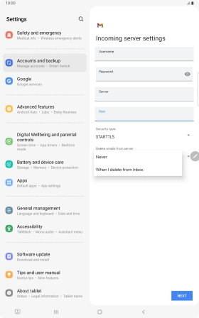 Press Never to keep email messages on the server when you delete them on your tablet.