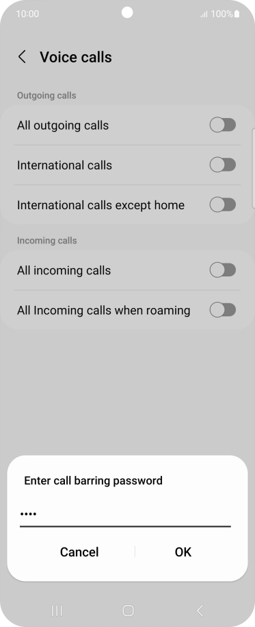 Key in your barring password and press OK. The default barring password is 0000.