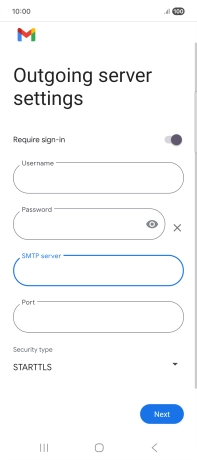 Press the indicator next to "Require sign-in" to turn the function on or off. Please note that if you're using Vodafone's outgoing server, turn off SMTP authentication and leave the username and password fields empty.