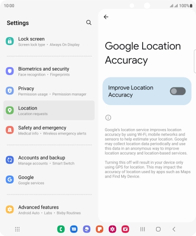 If you press the indicator next to "Improve Location Accuracy" to turn off the function, your phone can find your exact position using the GPS satellites but it may take longer as there is no access to supplementary information from the mobile network or nearby Wi-Fi networks.