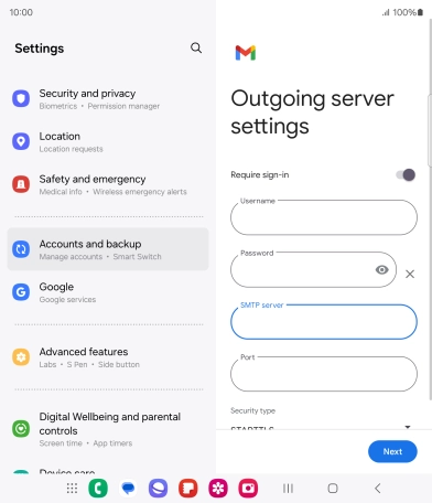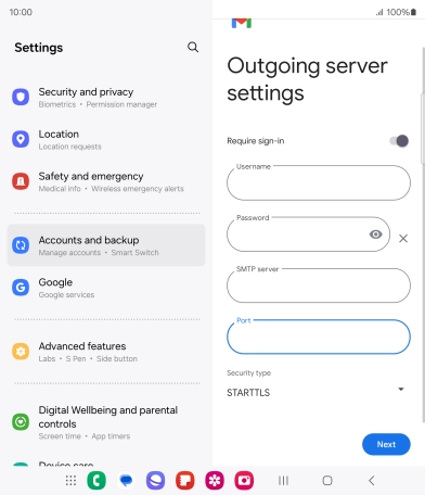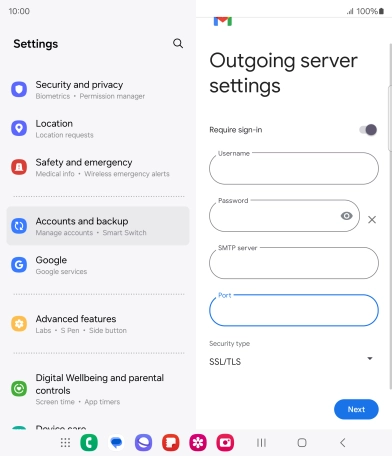 Press the indicator next to "Require sign-in" to turn the function on or off. Please note that if you're using Vodafone's outgoing server, turn off SMTP authentication and leave the username and password fields empty.