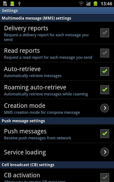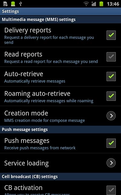 Press Delivery reports below Multimedia message (MMS) settings to turn the function on or off.