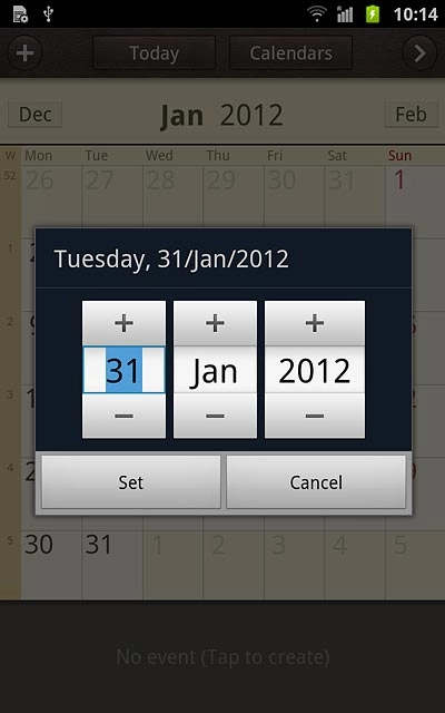 Press + or - next to day, month and year to select the date.