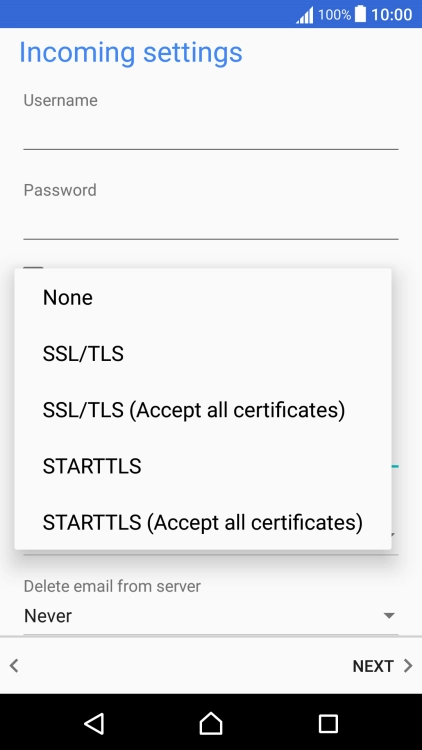 Press Never to keep email messages on the server when you delete them on your phone.