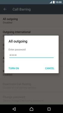 Key in your barring password and press TURN ON. The default barring password is 0000.