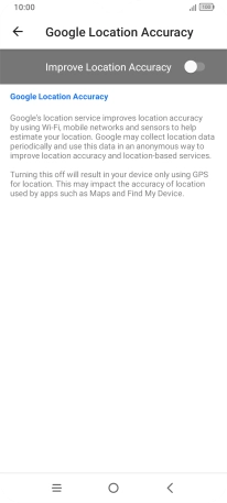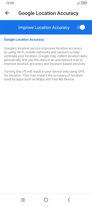 If you press the indicator next to "Improve Location Accuracy" to turn off the function, your phone can find your exact position using the GPS satellites but it may take longer as there is no access to supplementary information from the mobile network or nearby Wi-Fi networks.