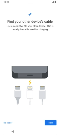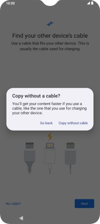 If you have a cable which can connect the two phones, insert the cable and follow the instructions on the screen to transfer content to your phone. If you don’t have a cable, press No cable?.