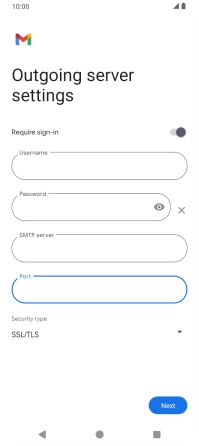 Press the indicator next to "Require sign-in" to turn the function on or off. Please note that if you're using Vodafone's outgoing server, turn off SMTP authentication and leave the username and password fields empty.